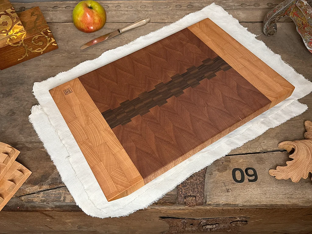 Warum Hirnholz? Weil sie robuster sind, „sich selbst heilen können“ und Messer schonen. Die Fasern stehen senkrecht – Schnitte schließen sich durch Feuchtigkeit wieder; die Brettchen bleiben langlebig. Und viele unserer Bretter bestehen aus Reststücken. Holz, das zu schade für den Ofen ist. Kleine Spuren, alte Schraubenlöcher oder Risse erzählen ihre eigene Geschichte – manche bleiben sichtbar, andere sind ergänzt. Alle sind einzigartig.